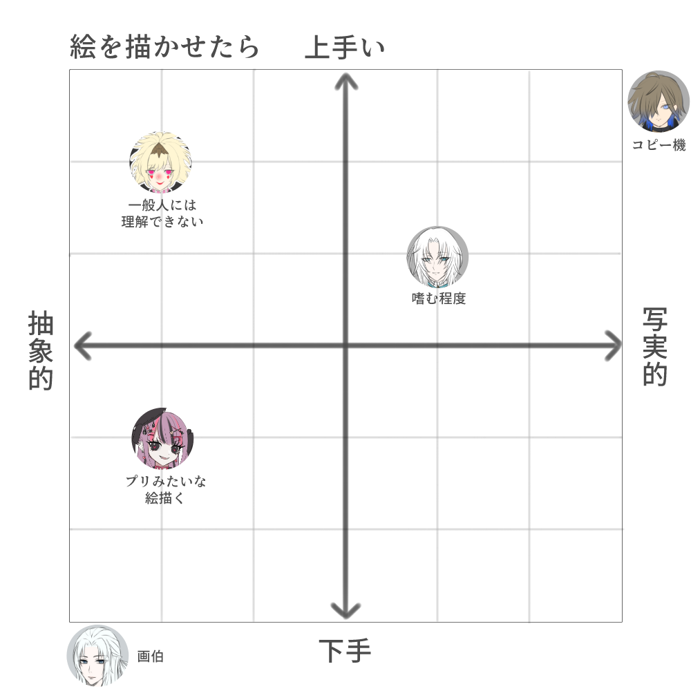 | 自分 | 素材多め、シンプルな衣装、猫目 |